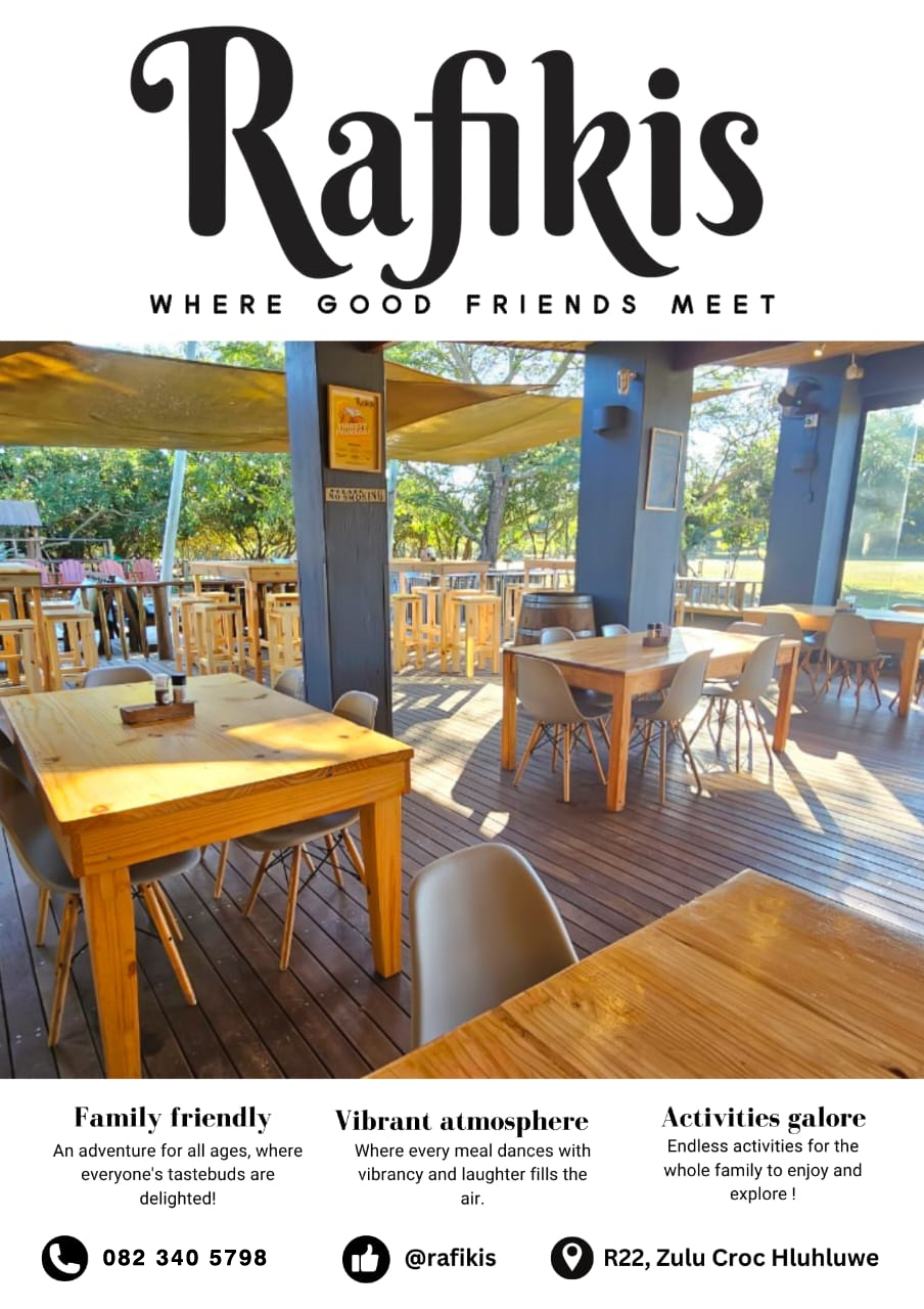 Rafiki’s At the end of an exciting and exhilarating tour of the park, why not relax at Rafikis, where you can sit back and reflect on the day’s activities.Rafikis (Restaurant):Whatsapp: 082 045 1647Phone: 082 340 5798 We now offer ceramic painting at Rafikis. Contact us for more information.